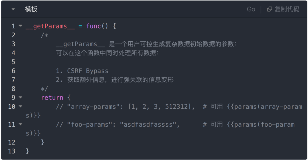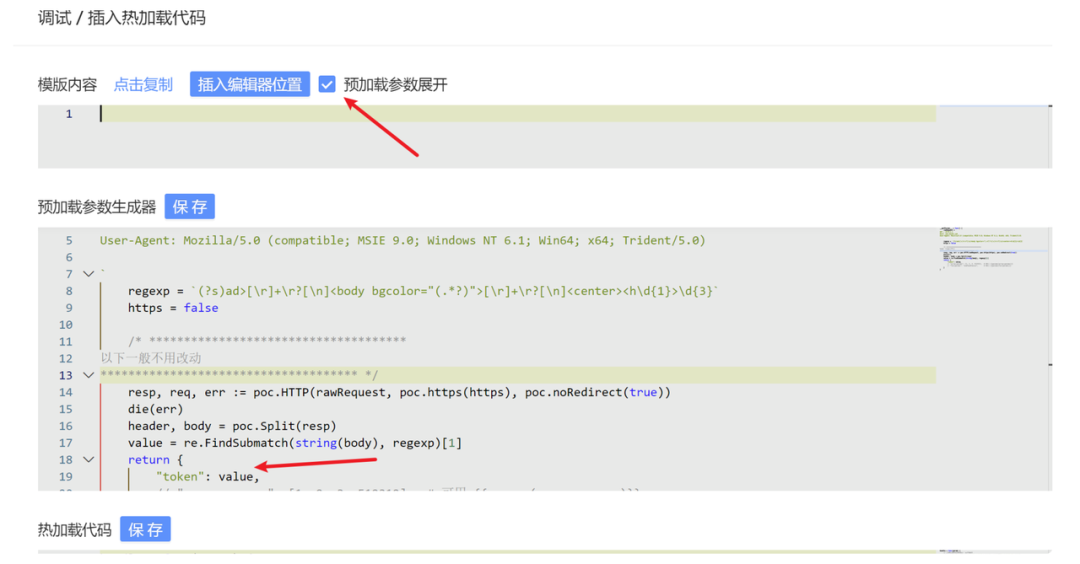 热加载,插⼊到预加载参数⽣成器,将提取的结果放到"token"这个参数中,后续就会渲染给 {{params(token)}}