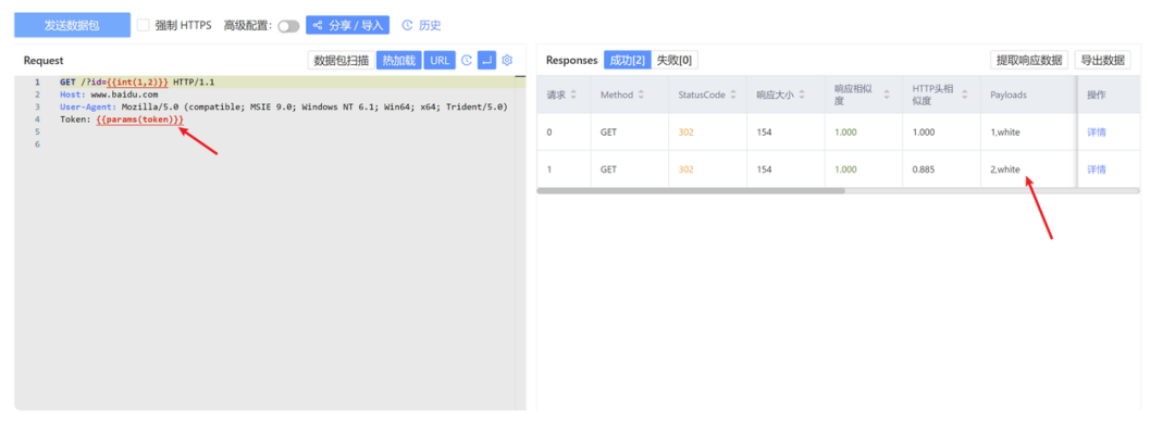 下面就是最后⼀步,插入Fuzztag{{params(token)}},发包后可以看到payloads里已经被渲染了。