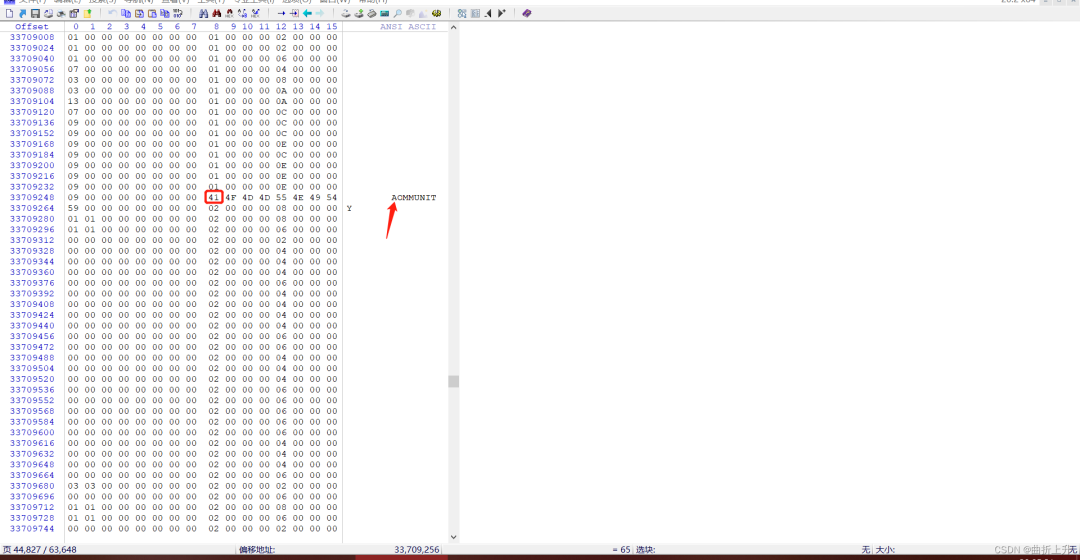 2.点击最上边的搜索,搜索十六进制数值。输入434F4D 4D554E495459。将43改为41。保存退出即可。