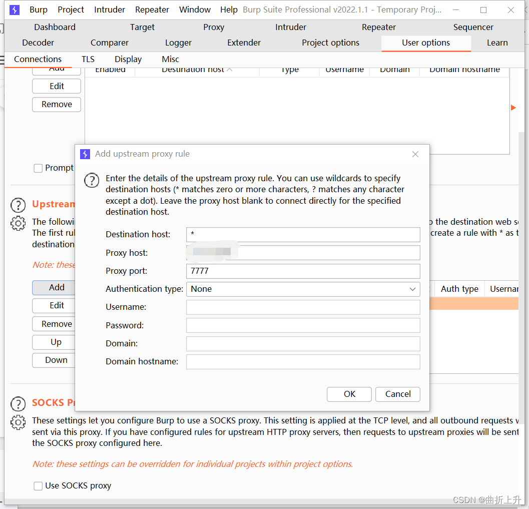 1.User options -> Upstream Proxy Servers -> Add2.启动xray监听。