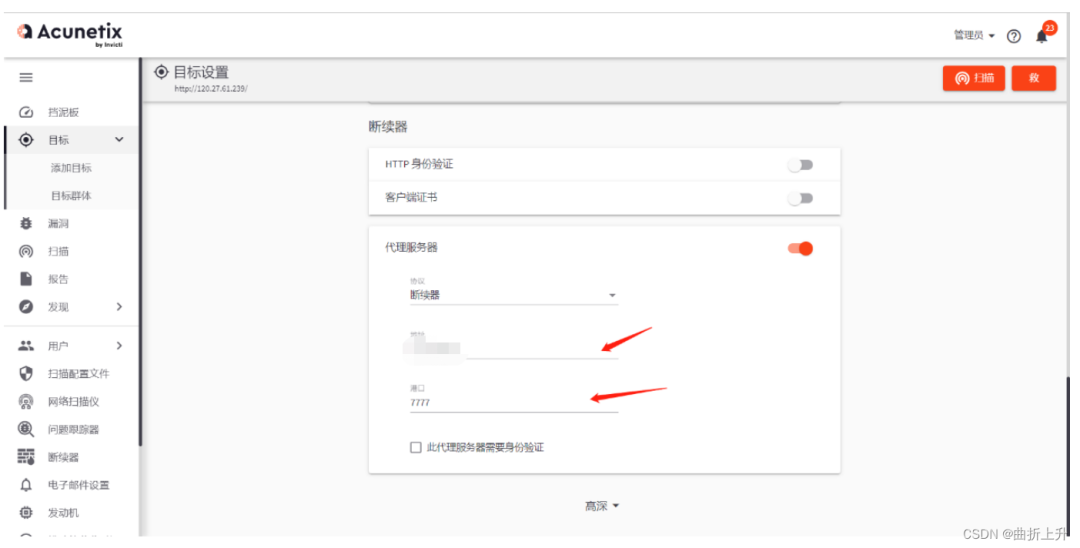 在添加扫描目标是配置代理服务器为VPS上Xray的监听端口
