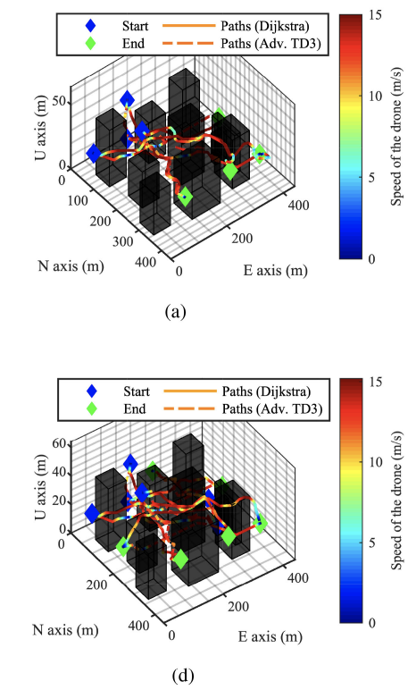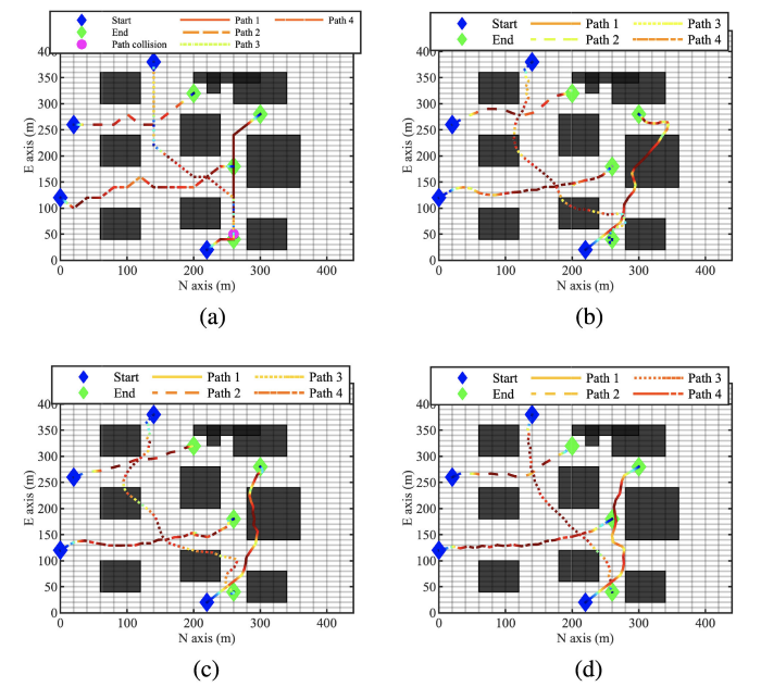 图8 北风情况下,多无人机路径(a) Dijkstra;(b) RRT;(c) Adv.DDPG;(d) Adv.TD3。
