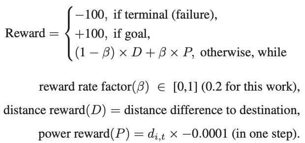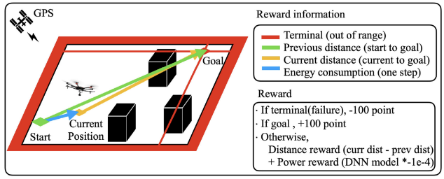图3展示了RL中的奖励功能模仿了人类的学习过程,它决定了无人机在执行行动后获得的奖励。Agent想要实现的目标的变化取决于奖励的设置方式。我们设置了一个奖励功能,以尽量减少无人机的能量消耗,直到它们到达最终目的地并安全执行任务。