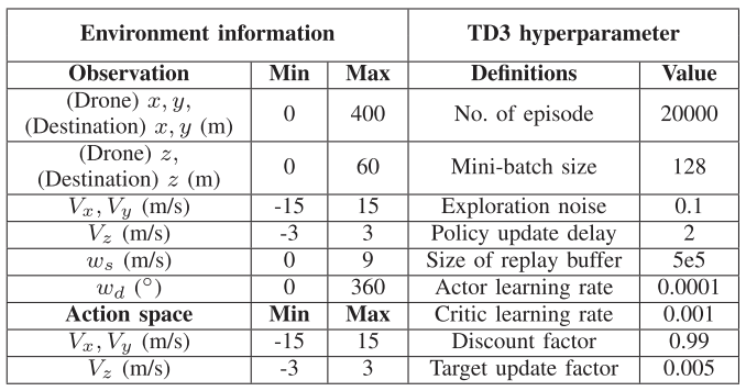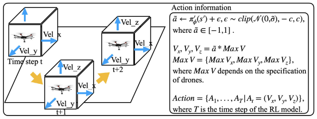 图2展示了将无人机在连续空间中的三轴速度设置为动作空间,并得到了在RL的每次迭代(无人机的每一个时间间隔)上控制无人机的新动作。Adv. TD3采用帧叠加技术,通过将演员网络的输出范围(˜a∈[−1,1])乘以无人机的最大速度来确定无人机的速度范围。基于DJI Matrice 600(大疆无人机型号),我们设其最大水平速度为15 m/s,垂直速度为3 m/s。无人机以4 Hz的采样率获取帧堆叠的状态,并在此工作中每秒钟执行一次动作。将无人机的速度纳入状态,推导出无人机在不同步骤之间移动的加速度,以便功率模型精确地预测功率消耗。