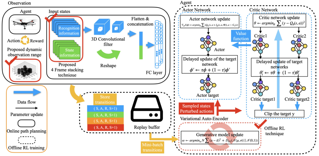 本文提出的Adv.TD3框架有两个主要组成部分:离线的RL训练和在线的路径规划问题。在离线的RL训练中,通过使用外部计算设备,解决了RL训练过程的巨大计算开销。批约束的深度q学习(Batch-Constrained Deep Q-Learning,BCQ)是一种离线RL算法,训练变分自动编码器(Variational AutoEncoder,VAE),是生成模型之一。它创建了一个扰动模型,扰动一些样本的抽取。然后,模型选择值函数值中结果最大的。