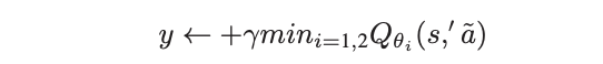 该方法解决了DDPG中的偏差高估,就像DDQN通过双q学习解决了DQN中的偏差高估一样。该方法选择两个参与者网络之间的低值函数,如双q学习作为目标值y,公式如下所示