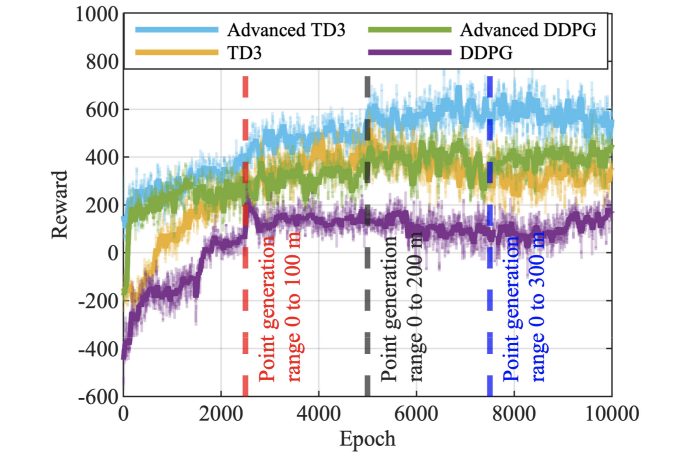 多无人机的训练模型通过替换每次迭代的风图来模拟风环境的变化。还通过逐渐增加从起点和目的地的距离来训练模型。最终结果如图所示,相较于其他算法,Adv. TD3收敛速度更高。