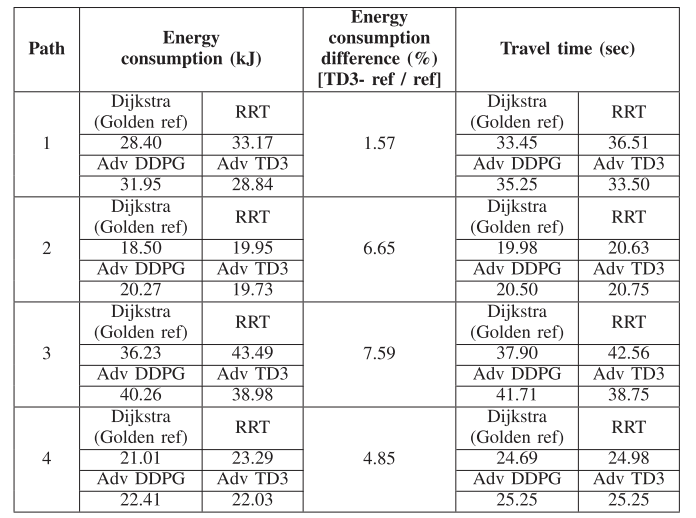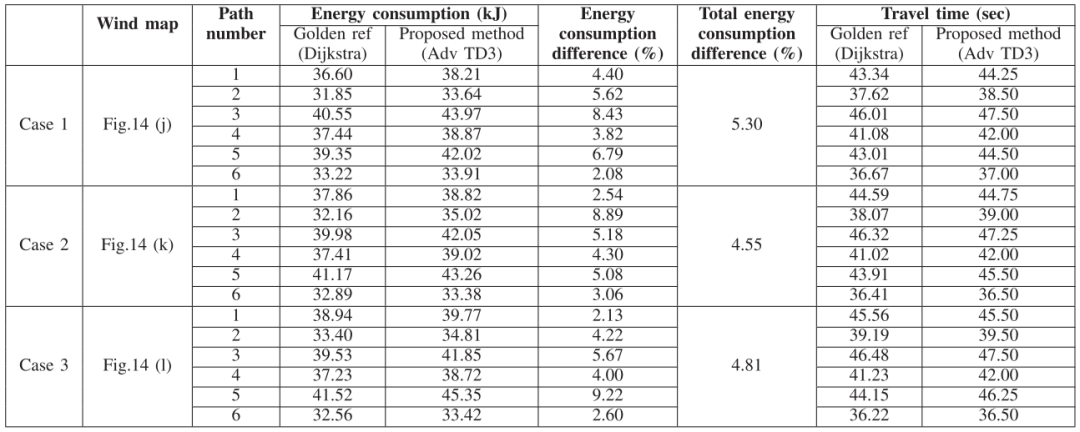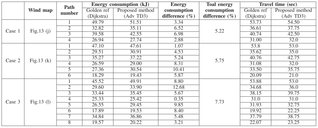 表5总结了在飞行期间出现干扰的地方。由于多条路径之间的相互干扰,会影响规划结果的能量消耗。但是这个问题需要通过重复计算来解决冲突,在给定的极端的时间内找到解决方案几乎是不切实际的。结果表明,Adv. TD3更接近实际的最优能量路径。