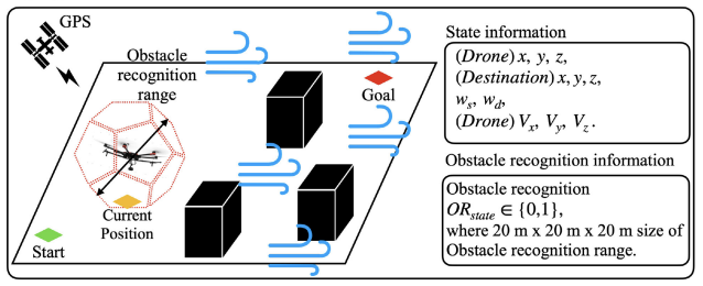 图1展示了将无人机工作的环境信息分为无人机的状态信息和认知信息。状态信息包括无人机的物理参数和影响无人机操作的外力,如无人机的当前位置、目的地、速度和特定状态下的风信息。认知信息为使用RGB-D摄像机和超声波传感器设置了障碍物识别范围。模拟实验中的无人机使用3D CNN来识别周围的环境。