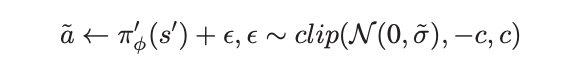 当actor网络推导策略时出现峰值时,DDPG很可能会高估策略的值函数。针对Q函数的平滑正则化策略可以防止策略网络的过拟合。Adv. TD3通过添加到目标动作上的噪声来适当地平滑目标策略,从而缓解了这个问题。具体公式如下