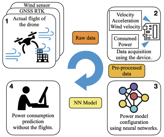 图4展示了能耗建模。该模型直接从无人机的实际飞行数据生成。还使用了无人机的直观数据,包括其速度(Vx,Vy,Vz),加速度(Ax,Ay,Az),风速ws,风向wd,有效载荷重量Pw,和有效载荷体积Pv。具体公式如下