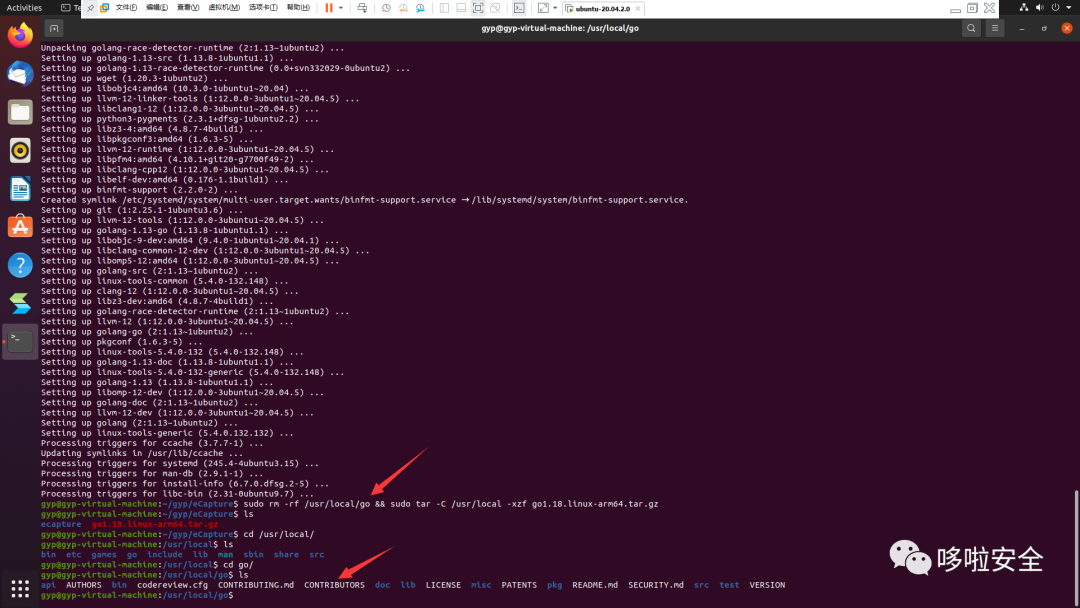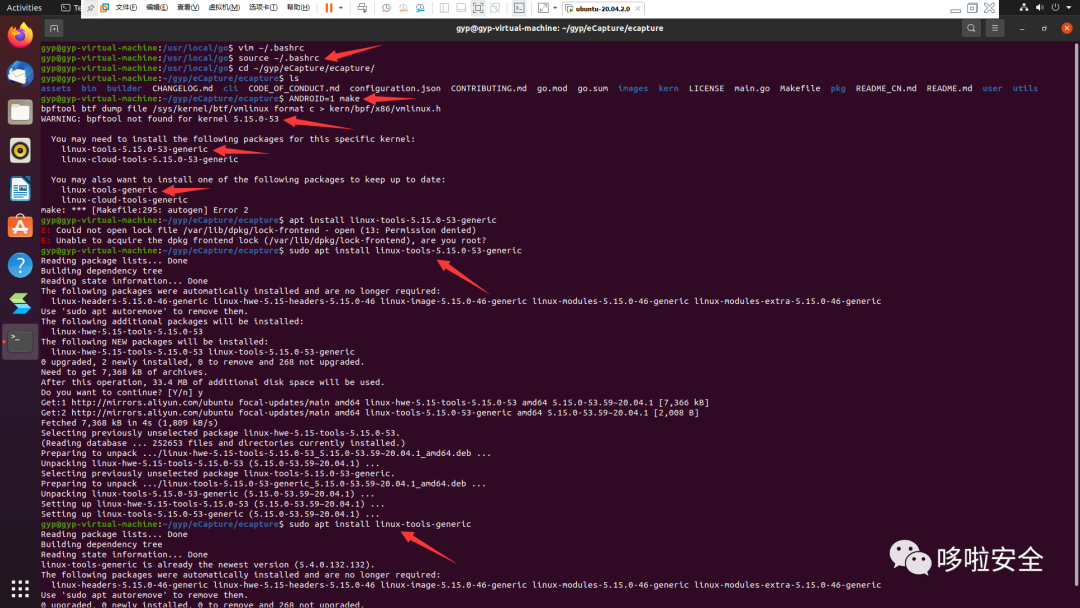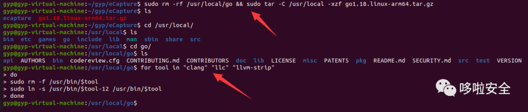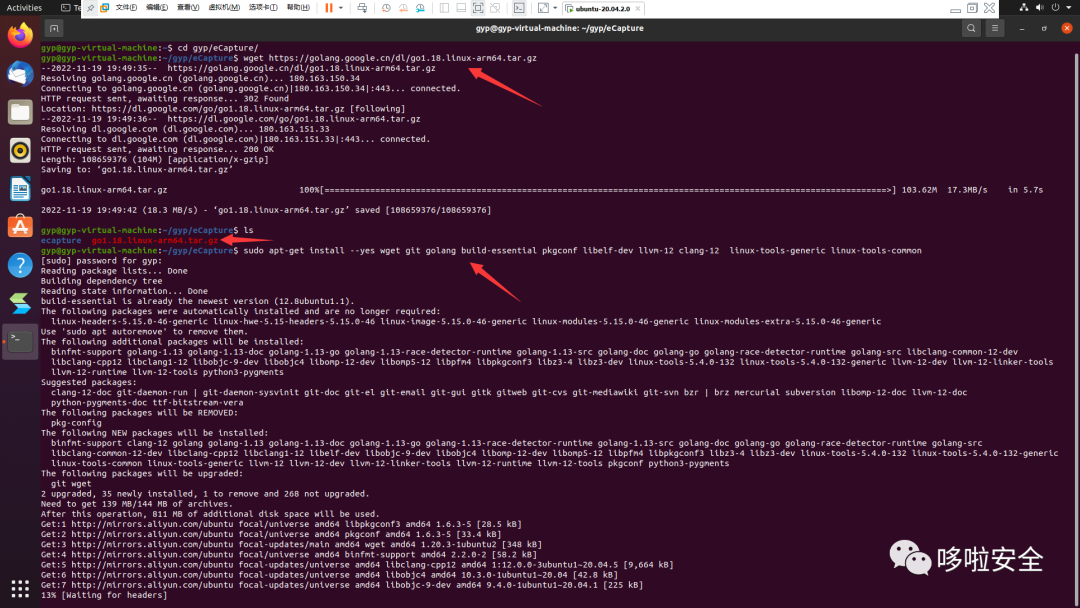 sudo apt-get install --yes wget git golang build-essential pkgconf libelf-dev llvm-12 clang-12 linux-tools-generic linux-tools-commonwget https://golang.google.cn/dl/go1.18.linux-arm64.tar.gzsudo rm -rf /usr/local/go && sudo tar -C /usr/local -xzf go1.18.linux-arm64.tar.gz