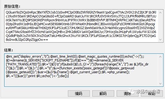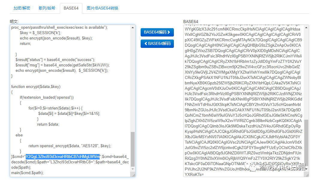 在内置的base64编码和解码器下,数据则会通过随机变量传递给base64_decode函数,通过解码还原后再交给eval函数执行。