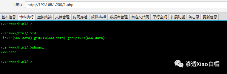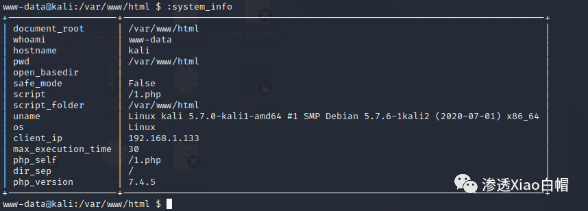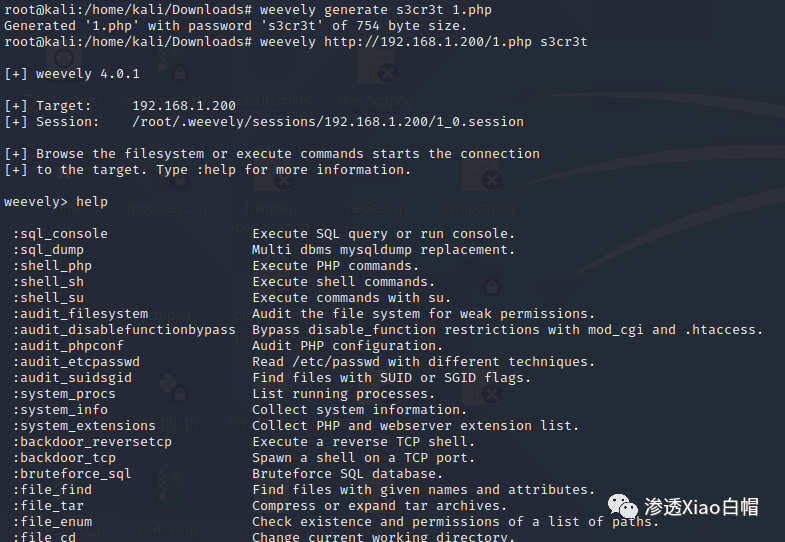 weevely也叫linux下的php菜刀,是一款使用python编写的webshell工具,集webshell生成和连接于一身,采用c/s模式构建。其具有很好的隐蔽性(生成随机参数且base64加密)。集成服务器错误配置审计,后门放置,暴力破解,文件管理,资源搜索,网络代理,命令执行,数据库操作,系统信息收集及端口扫描等功能。