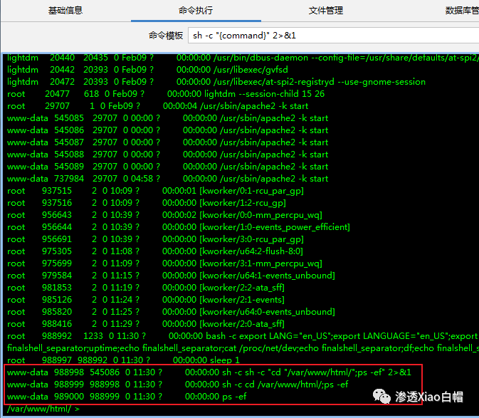 在执行命令的过程中冰蝎存在两个父子关系的进程进行操作,还可以通过进程进行检测。