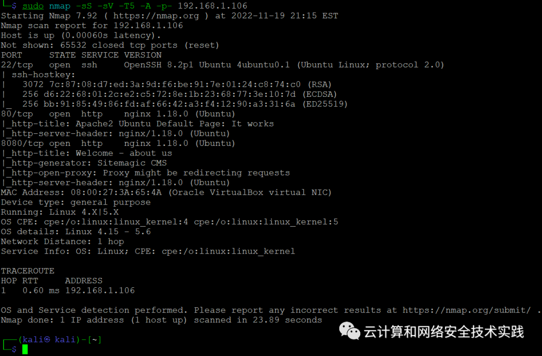 再继续做端口扫描,sudo nmap -sS -sV -T5 -A -p- 192.168.1.106,
