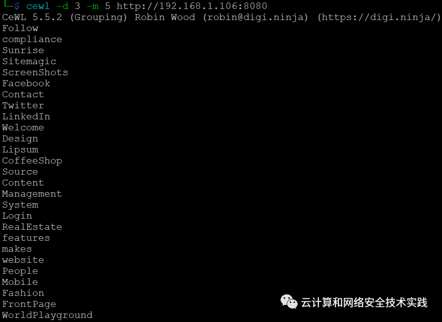 爬页面里的信息,cewl -d 3 -m 5 http://192.168.1.106:8080,