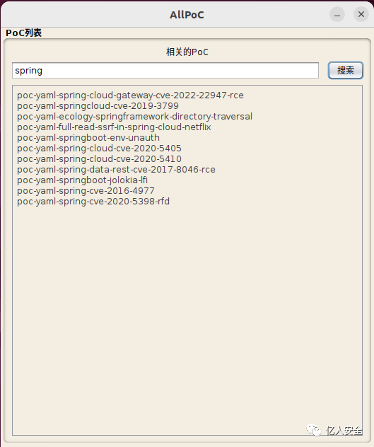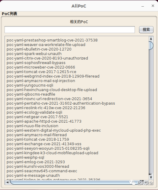 PoC 模块主要用于查询已支持的 PoC 有哪些,加载 xray 二进制文件完成后,建议先点击同步PoC数据库以更新最新的列表。点击查看所有Poc按钮后打开搜索界面。查询到希望的 PoC 后可以填入下方表单中,点击指定PoC确认设置。