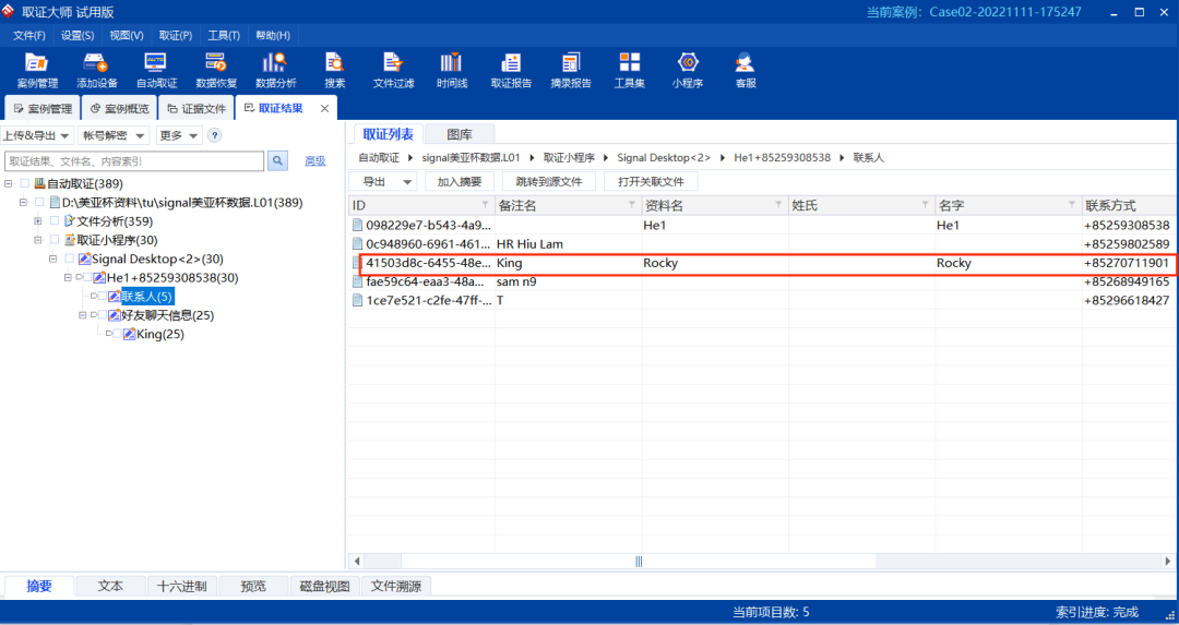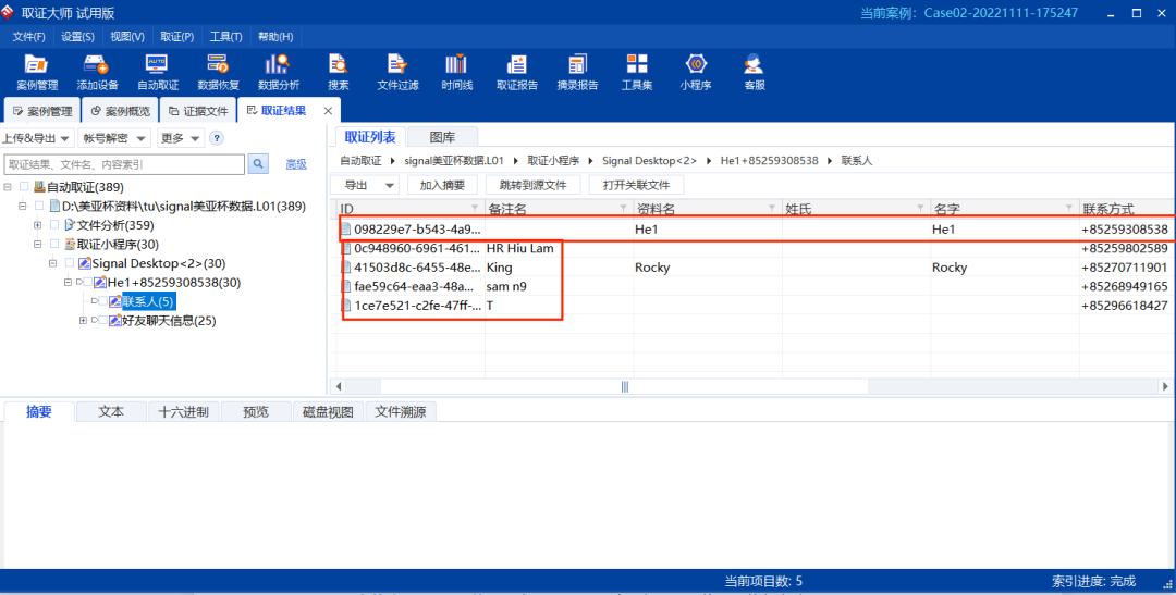 通过运行Signal小程序,可以在林浚熙计算机中知道他在Signal即时通讯软件中有五个联系人。在比对林浚熙手机号85259308538后,可知联系人中有一个为林浚熙本人,所以林浚熙在Signal的联系人有4个,如下图: