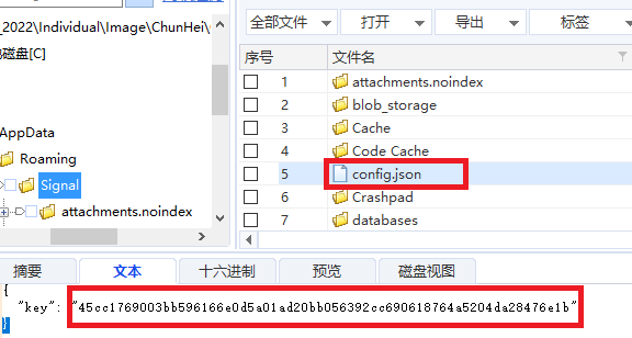 在配置文件“%AppData%\Roming\Signal\config.json”文件中可以找到数据库密码,如下图: