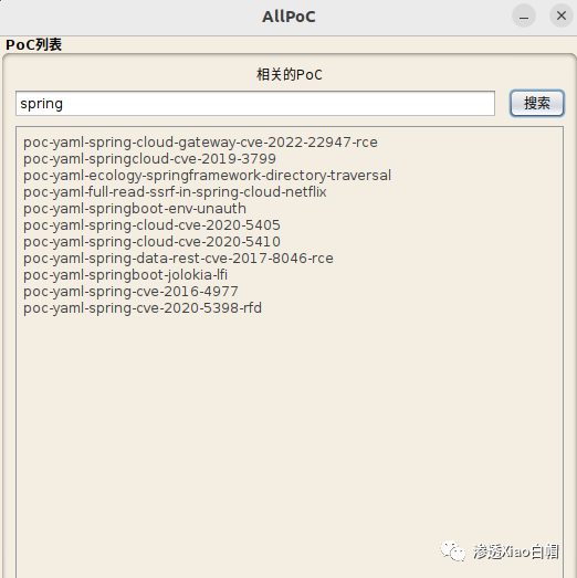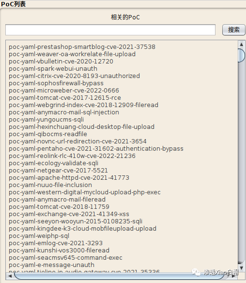 PoC 模块主要用于查询已支持的 PoC 有哪些,加载 xray 二进制文件完成后,建议先点击同步PoC数据库以更新最新的列表。点击查看所有Poc按钮后打开搜索界面。查询到希望的 PoC 后可以填入下方表单中,点击指定PoC确认设置。