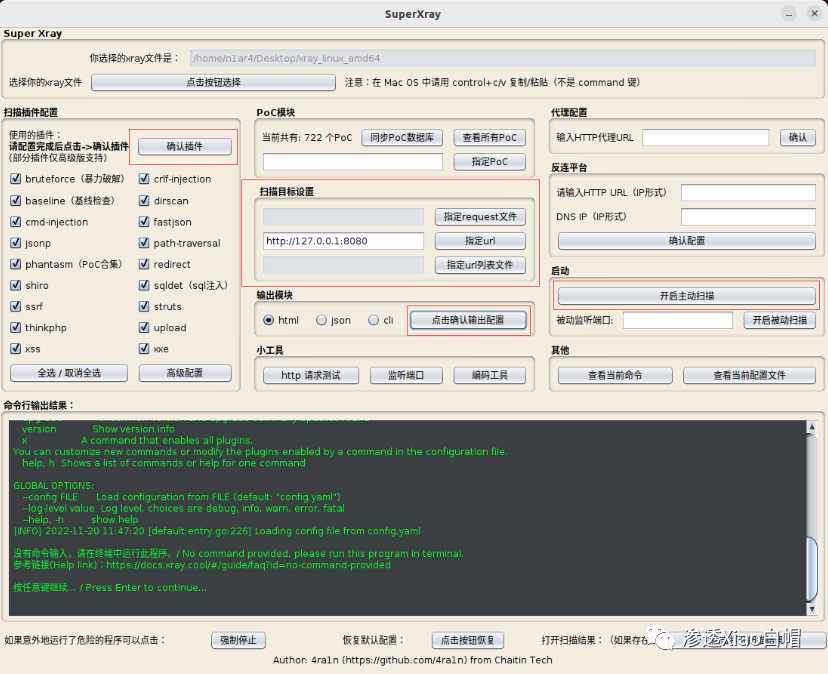 配置好插件或者指定了某个PoC必须有扫描目标设置(例如图中的url,输入完后请点击指定url确认)建议配置好输出模块,一般情况下建议使用 html 方式