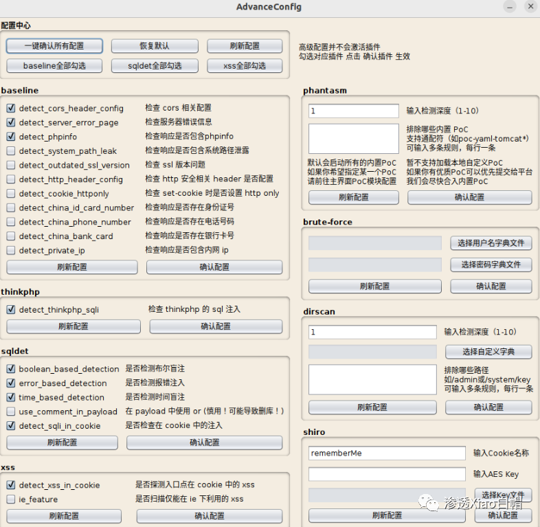 默认情况下是开启所有扫描插件的,手动勾选后请选择 确认插件后新配置生效