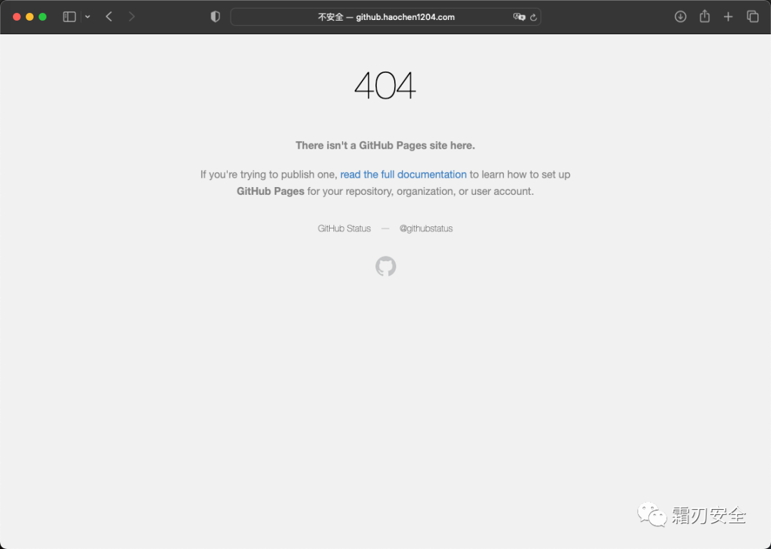 然后我们尝试使用浏览器访问域名,发现出现github的404,说明我们已经成功解析到haochen1204.github.io。这里为们还没有配置网站,需要在github上进行操作。