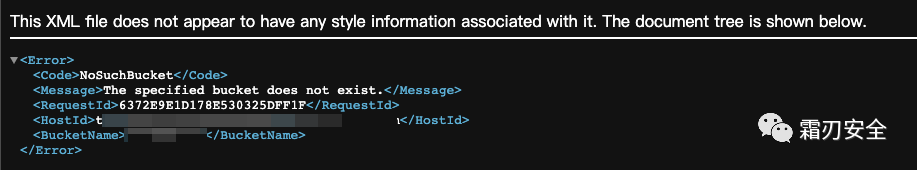 首先发现一个报错页面,在报错页面发现了HostId和BucketName两个字段,并且通过这两个字段我们知道他是使用阿里云对象存储提供服务的,并且给了oss存储对象的名称。这种接管方式下,两个字段缺一不可。
