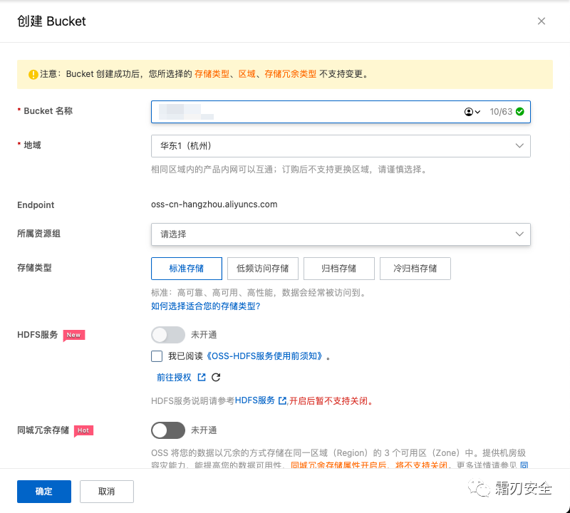 然后我们进入自己的阿里云,进入oss存储对象,创建一个新的Bucket,这里Bucket名称选择我们刚刚从报错页面中得到的HostId字段,注意下面的地区,我们在HostID或URL中可以得到关于地区的信息,要选择相同的地区。