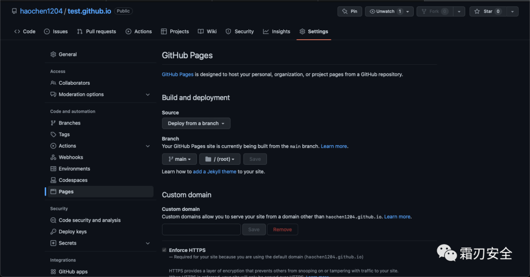 打开 Setting,然后点击Code and automation下的Pages 功能,并选择Source为main: