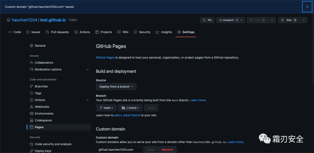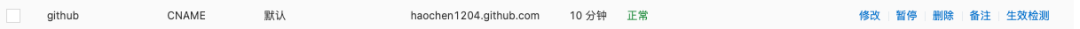 首先在域名解析处创建一个CNAME解析。将github.haochen1204.com指向haochen1204.github.io