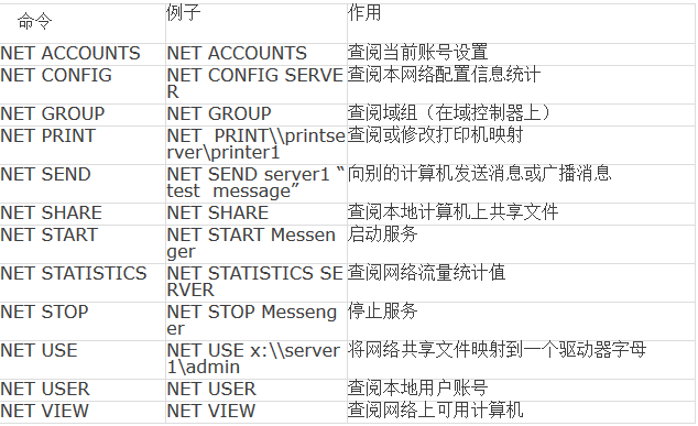 许多服务所使用的网络命令都以net开头,这些net命令有一些公用属性。要看到所有可用的net命令的列表,可以在命令提示符窗口键入net/?得到。
