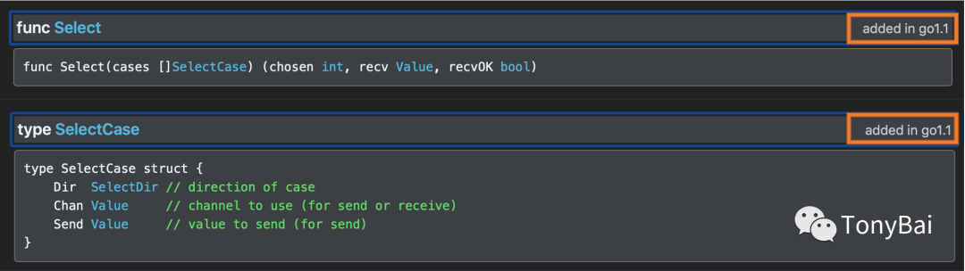很多朋友可能和我一样,因为没有使用过reflect包操作channel,就会以为reflect操作channel的能力是Go新版本才提供的,但实则不然。reflect包中用于操作channel的函数Select以及其切片参数的元素类型SelectCase早在Go 1.1版本就加入到Go语言中了,有下图为证: