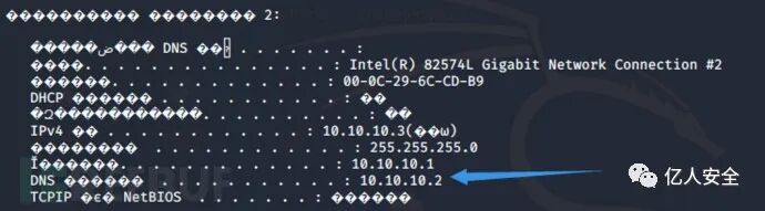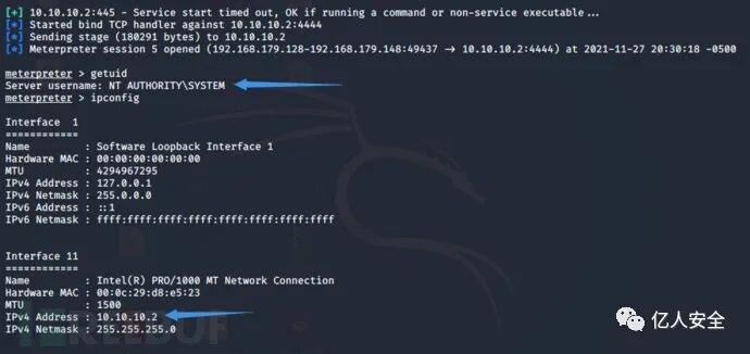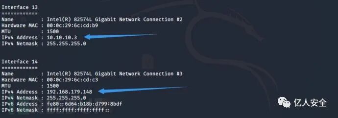 meterpreter >ifconfig 发现有两个网卡,其中包含10(内网)网段