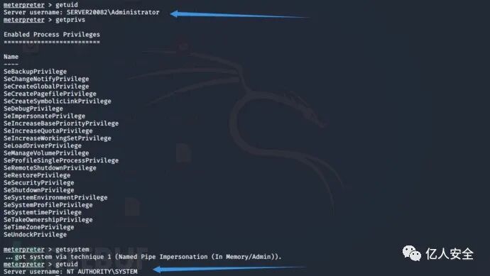 使用 mimikatz 模块需要 System 权限,所以我们在使用该模块之前需要将当前 MSF 中的 shell 提升为 system
