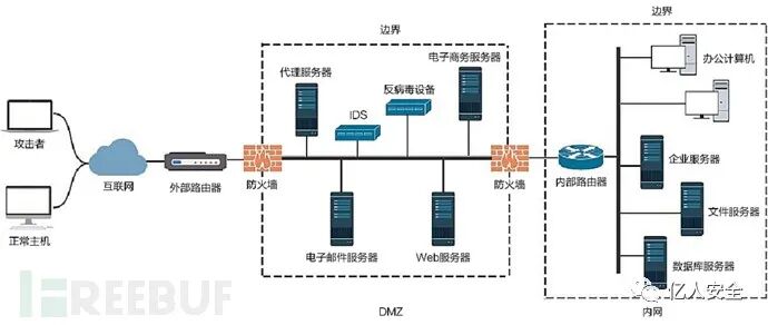 一个典型的中小型内网的安全域划分,如下图所示,一个虚线框表示一个安全域(也是网络的边界,一般分为DMZ 和内网),通过硬件防火墙的不同端口实现隔离