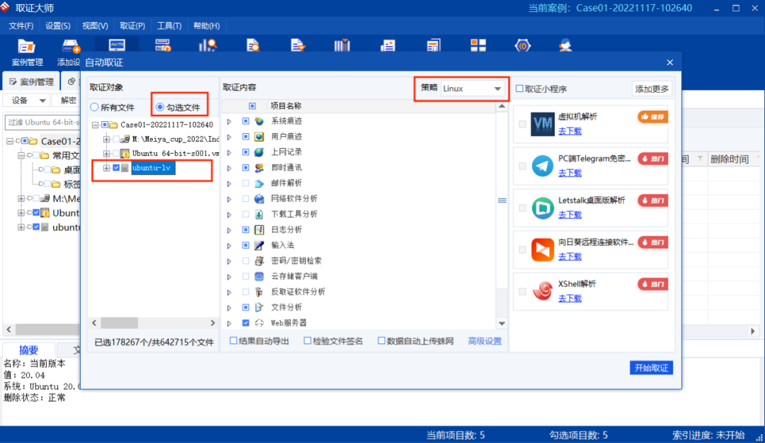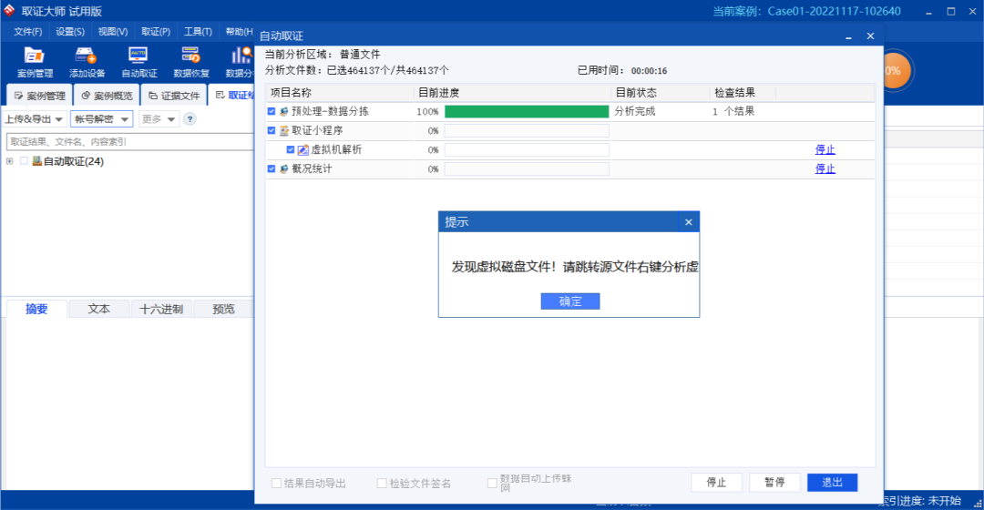 运行“虚拟机解析”小程序时,在自动取证过程中会提示“发现虚拟磁盘文件!请跳转源文件右键分析虚拟机”这一弹窗,这也是在提醒我们虚拟磁盘文件中包含着重要信息,让我们注意。
