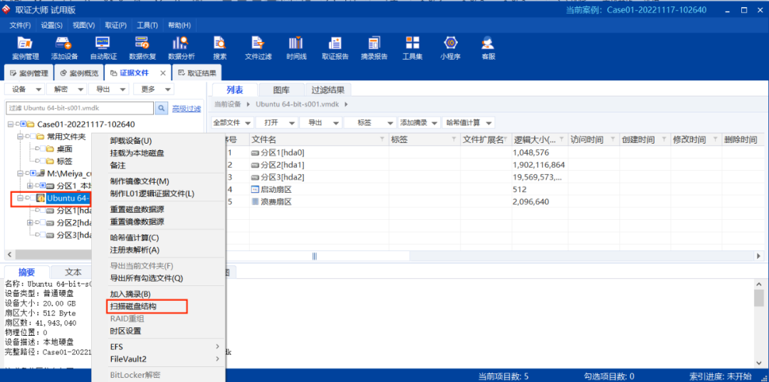 虚拟磁盘解析后我们会看到证据文件多了一个带有红色感叹号的分区,这个时候我们只需要选择该分区,然后右键点击扫描磁盘结构。