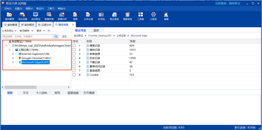 暗网取证部分考题问及嫌疑人计算机中包含几个浏览器,其中 Internet Explorer、 Opera、Microsoft Edge、Google Chrome等四个浏览器用取证大师自动取证即可解析出是否使用过。