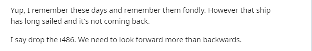 日前,Linus Torvalds表示,已经考虑在Linux内核中终止对英特尔i486处理器的支持。“早在2012年,我们就放弃了对i386的支持,也许是时候在2022年摆脱对i486的支持了?”在关于内核如何更好地处理LAU(least-recently-used,最近最少使用)列表的讨论中, Torvalds深入探讨了这一话题。当他调查贡献者代码时,他发现,需要包含迎合古老CPU的变通方法时常让人沮丧,因此,他建议终止对旧套件的支持可能是解决内存问题的更简单方法。不过他也指出,并非完全否定了i486类硬件的存在意义,只是从内核开发的角度看,i486应该“退场”了。“我真的不认为i486类硬件是毫无价值的。我确信它有其存在的意义(Maciej就是一个例子)。但是从内核开发的角度来看,我不认为它们是有价值的。在某种程度上,人们把 i486当作博物馆的展品,既然如此,不如让它们运行可以进博物馆的内核。”At some point, people have them as museum pieces. They might as well run museum kernels.Torvalds进一步提到,“维持i486的正常运行所需要的工作是我们根本不应该承担的维护负担——没有开发人员真正关心,也没有人真正测试那种情况,但这也意味着代码只会随机地不起作用。”Torvalds的话意味着,Linux内核主线的最低x86处理器支持型号可能将不再是i486。他表示,或许应该让x86-32架构支持的最低版本提高到cmpxchg8b,意指奔腾及更高版本。资料显示,英特尔于1989年4月10日在拉斯维加斯电脑展上首度发布80486。这一处理器采用了1μm(微米)制造工艺,内部集成了120万个晶体管,时钟频率由25MHz逐步提升到50MHz。值得一提的是,英特尔首次在80486中使用了多重管线技术。所谓多重管线,指的是CPU在取址的时候有一个流水线,80486的四个部件(总线部件、解码部件、执行部件、写回部件)可以分别同时流水线化的操作,即同一时间有一条指令在执行、上一条指令在被写回、下一条指令在被解码、下下一条指令在被总线读取。如此一来,就能实现在一个CPU时钟周期完成一条指令,提升了CPU的运算速度。另外,80486还采用了突发总线传送方式,大大提高了与内存的数据交换速度。由于这些改进,80486的性能比带有80387协处理器的80386提高了4倍。80486可以说是英特尔x86系列中的一款经典处理器,如今担任英特尔CEO的帕特·基辛格(Pat Gelsinger)正是当时80486处理器的架构师。在技术的车轮滚滚向前之际,这款算得上非常成功的处理器如今也蒙上了历史的烟尘,到了“忆往昔”的年纪。在Reddit论坛上,围绕“Linux 内核可能放弃对英特尔 i486处理器的支持”这一议题,一些开发者也发表了他们的观点。有人怀念用486DX运行Linux的日子,但也清晰地意识到往事不可追。“船已远行,不可回返。放弃i486,我们应该向前看,而不是往后看。”开发者留言截图@Reddit对此,不少开发者也给予了认同。“尽管看到这些机器被放弃令人难过,但我也很难想象在如今的世界如何用这样的设备来完成任何有用的工作。”开发者留言截图@Reddit在Linux的进化之路上,取消对于i486的支持或许只剩下时间问题。参考链接:https://www.theregister.com/2022/10/25/486_support_linux_kernel_endinghttps://www.reddit.com/r/linux/comments/ycy33i/who_here_has_mixed_feeling_about_linux_dropping/--- EOF --- 推荐↓↓↓