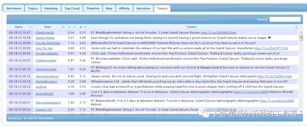 除了情绪之外,您还可以根据主题、热图、Tagcloud、时间轴、亲和力等来分析您的推文。