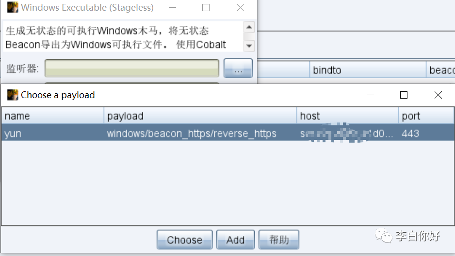 生成木马,监听器选择刚刚创建的云函数监听:(天翼云无法使用80,443端口,需要建立两个监听器,一个监听器为云函数公网域名,443端口(或80),用来生成木马用,另一个监听为服务器ip,云函数代码中对应的端口,即真正回连的端口)