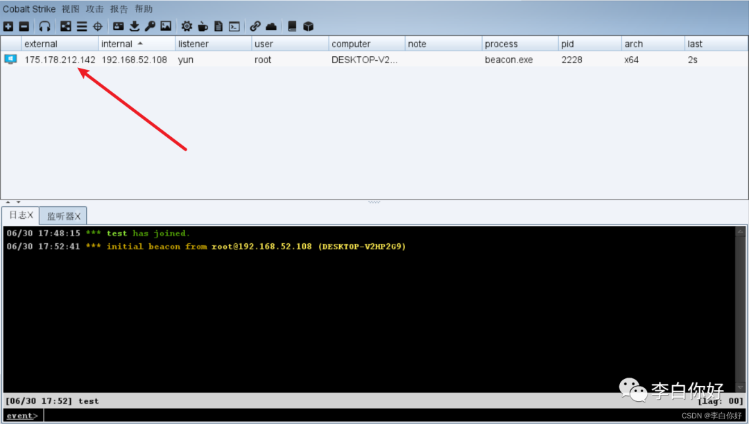 运行木马后成功上线,其中由于云函数的缘故,图中的external ip地址会一直变化: