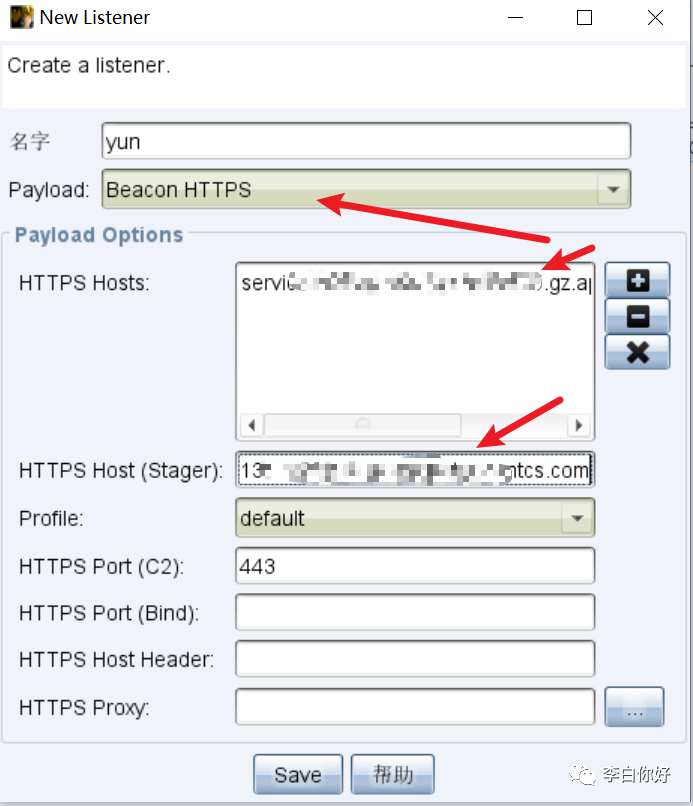 ./teamserver <ip> <password> ./kris.profile登录CS后,新建监听器,根据云函数代码填的是https则payload也选择Beacon HTTPS,HTTPS Hosts及HTTPS host均填写云函数公网域名(上文中红框部分),端口与云函数代码中的一致: