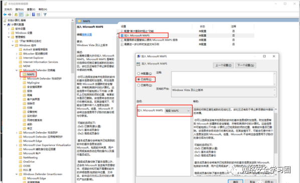 在组策略编辑器中找到计算机配置模版管理模版Windows 组件Windows Defender 防病毒MAPS。