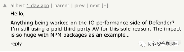 也有Web开发者来吐槽,说Windows Defender的安全防护能力确实够用,就是硬盘读写性能太差。